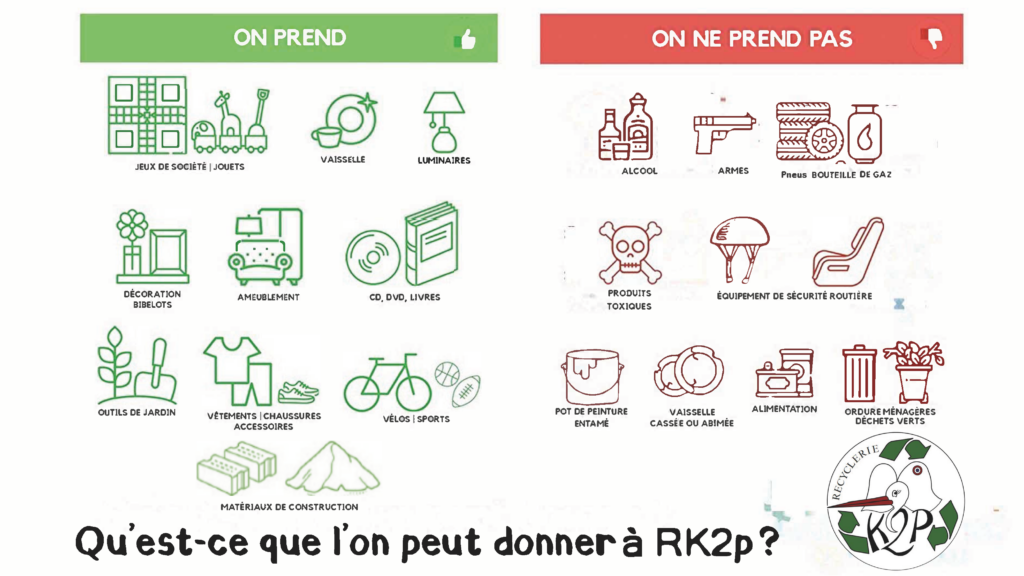 Nous prenons : les jeux, les jouets, les vélos, le matériel de sport, les vêtements, les meubles, les bibelots, les livres, les CD, les DVD, la vaisselle, l’électroménager, les luminaires, la déco intérieur et extérieur, l’outillage, les outils de jardin, les matériaux de construction…